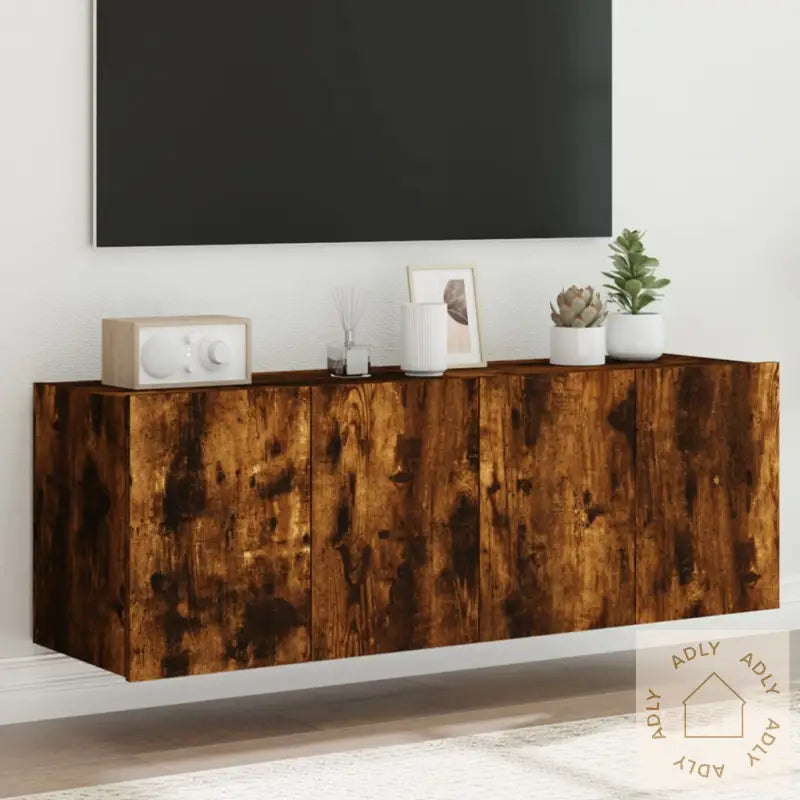 Slitesterkt materiale: Benkene er laget av konstruert tre, som har en glatt overflate og høy kvalitet. Dette materialet er kjent for sin styrke, stabilitet og evne til å tåle fuktighet over tid – perfekt for møbler til hjemmet som skal holde seg fine lenge.RGB LED-lys: Veggskapene har integrerte RGB LED-lys, som lar deg skape akkurat den stemningen du vil ha. Du kan velge mellom mange ulike farger eller sette lyset til å endres automatisk via brukervennlige menyer. Disse LED-lysene gir ikke bare en ekstra wow-effekt, men fremhever også det trendy designet og gjør skapene til et blikkfang i stua.Rikelig med lagringsplass: Med sine to rom bak dørene har hver TV-benk god plass til å organisere alt fra bøker og magasiner til DVD-er og småelektronikk. Alt ligger samlet og lett tilgjengelig, uten rot i stuen.Allsidig: Dette skapet passer ikke bare som TV-benk, det fungerer også ypperlig som vegghengt nattbord eller kombinert med andre moduler for å lage en unik vegg. Mulighetene er mange når du vil tilpasse møblene til hjemmet ditt.Veggmontert design: Den plassbesparende løsningen frigjør gulvplass og gjør rommet luftigere. Spesielt i mindre leiligheter gir veggmontert funksjon deg mer rom til andre møbler, som sofa eller hagemøbler hvis du har åpen løsning mot uterom.Godt å vite: