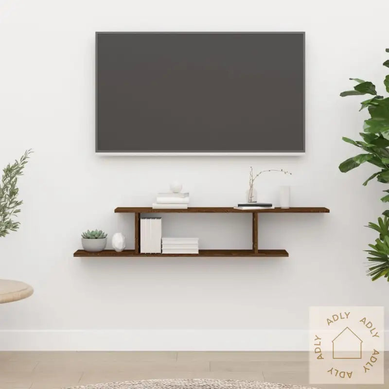Denne stilige, praktiske og elegante veggmonterte TV-hyllen i brun eik er virkelig et iøynefallende tillegg til hjemmet ditt og tar inn det beste innen moderne møbler til hjemmet. Perfekt for deg som ønsker bokhyller og stående hyller med et unikt uttrykk, og samtidig ønsker å få maks ut av rommet ditt.