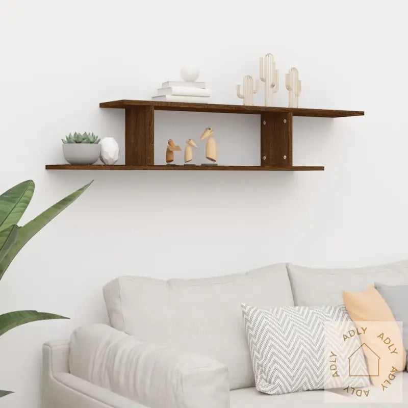 Premium materiale: Denne vegghyllen er laget av konstruert tre i høy kvalitet, kjent for sin glatte overflate, styrke og stabilitet, og ikke minst motstand mot fuktighet. Brun eik gir et eksklusivt, tidløst preg som passer i de fleste interiørstiler. Materialet gjør også at hyllen er lett å holde ren – tørk bare over med en fuktig klut for å fjerne støv eller smuss.Praktisk hylle: Hyllen gir masse fleksibilitet – enten du trenger plass til TV-utstyr som DVD-spiller og AV-komponenter, favorittbøkene dine, magasiner, små planter, spillkonsoller eller dekorative gjenstander, får du alt opp fra gulvet og lett tilgjengelig. Dette gjør hyllen til et allsidig tillegg til andre bokhyller og stående hyller i hjemmet ditt.Veggmontert design: Siden denne hylla monteres rett på veggen, sparer den verdifull gulvplass – ideelt i både små og store rom. Romløsningen blir mer åpen og luftig, og gir samtidig god lagringsplass.Unikt design: De to hyllene har en asymmetrisk utforming, slik at de kan monteres motsatt av hverandre – en til venstre og en til høyre – alt etter hva som passer best på veggen din. Dette gir mulighet for en personlig og dynamisk uttrykksform som snur tradisjonelle bokhyller og møbler til hjemmet litt på hodet.Med sitt smarte veggmonterte design og tidløse utseende, passer denne hyllen perfekt sammen med annen innredning, enten du er ute etter praktisk oppbevaring eller stilfulle detaljer. Den er flott alene eller sammen med andre hagemøbler eller bokhyller for et helhetlig uttrykk hjemme.