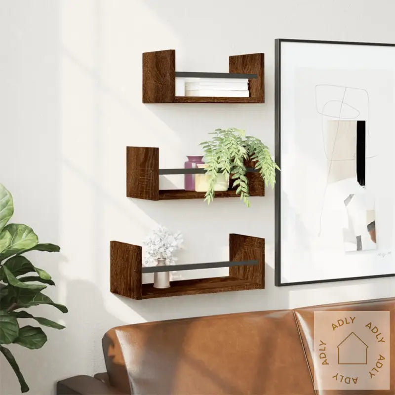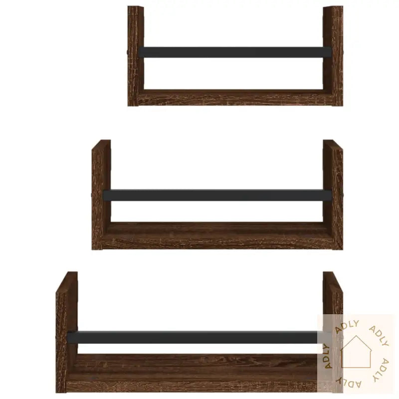 Skruer og plugger for veggmontering følger ikke med. Sørg for å velge feste som passer akkurat til din veggtype, og kontakt profesjonell hjelp ved behov. Følg alltid instruksjonene nøye for trygg og enkel montering.Farge: brun eikMaterialer: konstruert tre, stålMål: 30/35/40 x 16 x 14 cm (B x D x H)Montering kreves: jaLeveransen inneholder:3 x vegghyller