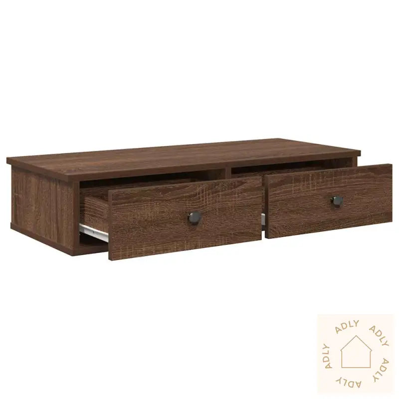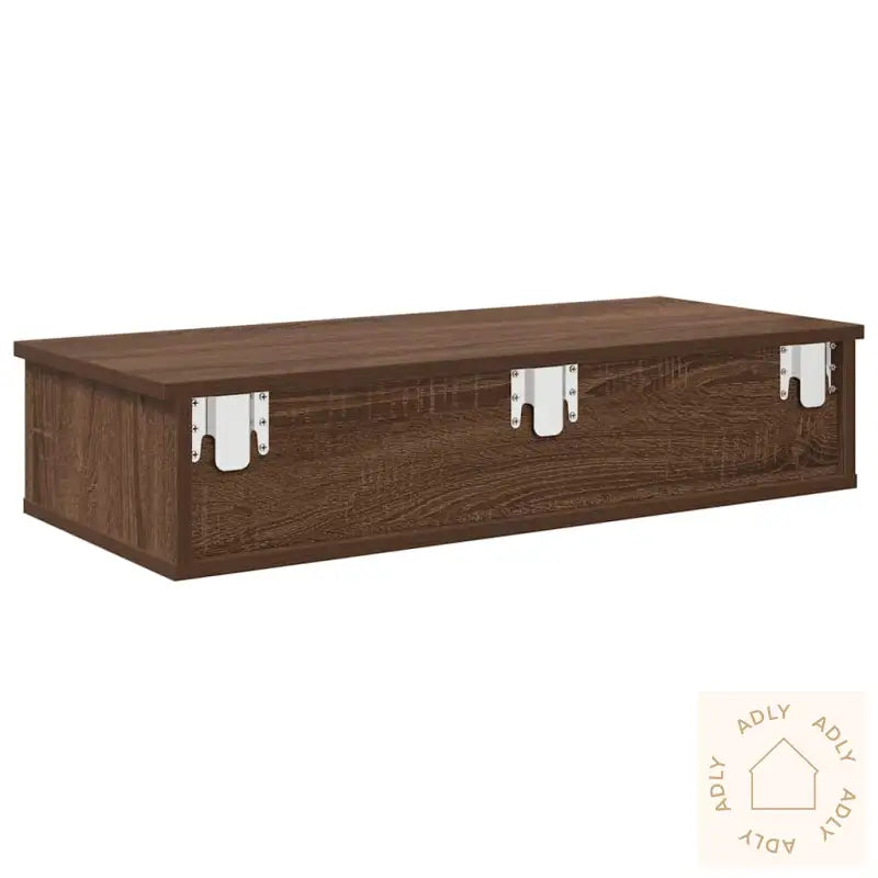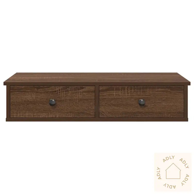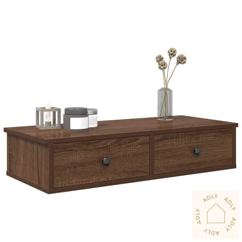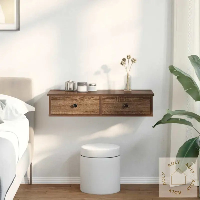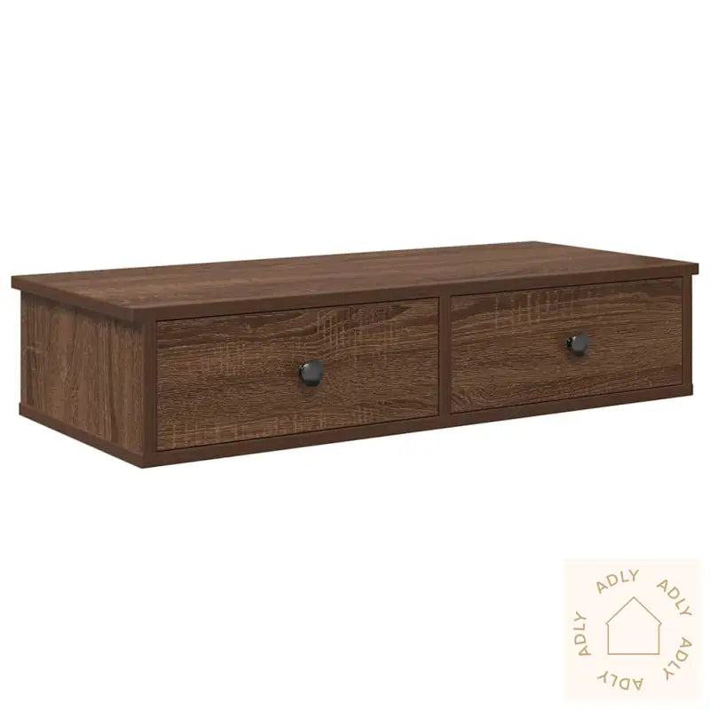 Stabilt og slitesterkt materiale: Hyllen er laget av konstruert tre, kjent for sin holdbarhet og stabilitet. Overflaten er jevn og designet for å tåle både fukt, vridning og sprekker over tid. Dette gir en solid følelse og langvarig bruksglede, enten den plasseres alene eller sammen med andre møbler i brun eik.Rikelig med oppbevaringsplass: Du får god plass til å organisere alt fra bøker til småting du bruker daglig. Skuffene holder ting ute av syne men likevel lett tilgjengelig.Veggmontert funksjon: Siden hyllen monteres på veggen tar den ingen gulvplass – ideelt hvis du vil ha mer rom i boligen, enten det er på soverommet, stua eller entreen. Den flytende looken gjør den ekstra moderne og lett å kombinere med både klassiske og moderne hagemøbler og hjemmemøbler.Visningsmulighet: Toppen av skapet fungerer som en elegant flate hvor du kan sette favorittdekorasjoner, bilder eller grønne planter og gjøre rommet mer personlig.Allsidig bruk: Den tidløse, brun eik-fargen glir naturlig inn i de fleste interiørstiler, så skapet passer like godt i stuen som på soverommet. Dette er møbler som både løfter looken og gjør hjemmet mer brukervennlig.Godt å vite: