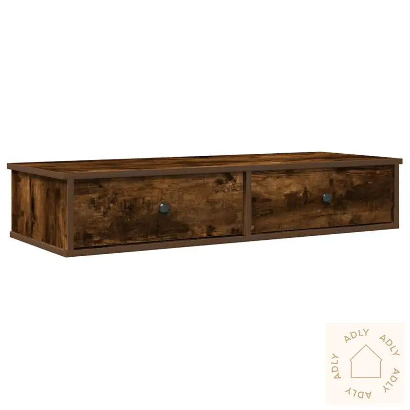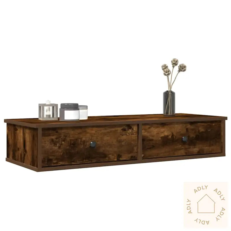 Stabilt og slitesterkt materiale: Hyllen er laget av konstruert tre, et robust og holdbart materiale med jevn overflate. Dette gir ikke bare lang levetid, men gjør den også motstandsdyktig mot fukt og deformasjon. Derfor passer denne hyllen utmerket i alle rom hvor du trenger solide møbler, enten det er i stuen eller blant dine bokhyller og stående hyller.Rikelig med oppbevaringsplass: Det smarte veggskapet har god plass i skuffene, så du kan enkelt holde orden på alt fra småsaker og magasiner til elektronikk – alt innen rekkevidde og alltid ryddig plassert.Veggmontert funksjon: Siden hyllen festes på veggen, frigjør du gulvplass og får en luftigere følelse i rommet. Den passer perfekt der hvor du vil utnytte plassen bedre uten store, klumpete møbler.Visningsfunksjon: Du kan lett bruke toppen av skapet til å vise frem bilder, dekor, planter eller dine favorittfigurer for å gjøre hjemmet ekstra personlig og innbydende.Brede bruksområder: Den tidløse designen gjør at denne vegghyllen matcher de fleste stiler og enkelt kan kombineres med andre møbler, enten du trenger praktisk oppbevaring i stue, soverom eller hjemmekontor. Din innredning får et løft, samtidig som funksjonaliteten ivaretas.Godt å vite: