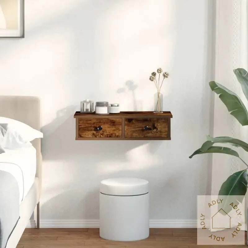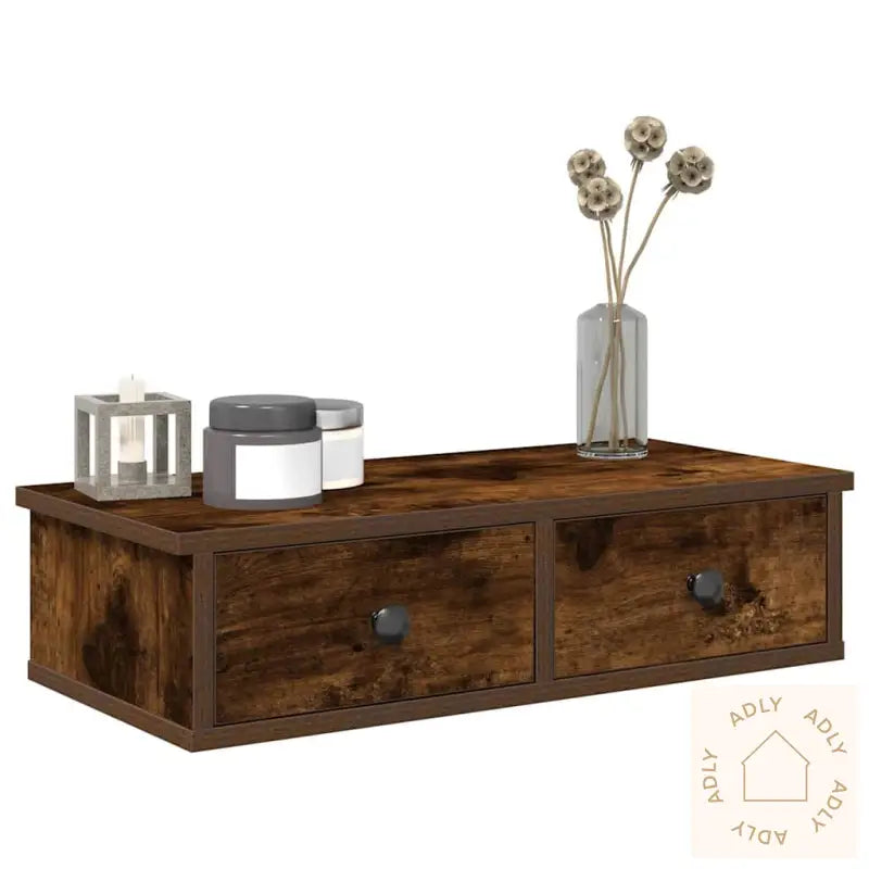 Stabilt og slitesterkt materiale: Vegghyllen er laget av konstruert tre, et robust og varig materiale kjent for sin jevne overflate samt motstandsdyktighet mot fuktighet, vridning og sprekker. Dette sikre materialvalget gir deg et pålitelig møbel i mange år fremover, enten det brukes innendørs sammen med andre møbler eller kombineres med ulike stiler i hjemmet.Rikelig med oppbevaringsplass: De romslige skuffene gir god plass til å organisere småting, hverdagsartikler og det du helst vil ha lett tilgjengelig. Med denne løsningen holder du ting ryddig og får mer ut av plassen uten at det blir rotete.Veggmontert funksjon: Skapet tar ikke noe gulvplass, noe som er genialt hvis du har små rom eller ønsker en mer luftig stil. Det er også enkelt å henge opp på veggen akkurat der du vil ha det, og det gir en moderne, flytende effekt.Visningsfunksjon: Toppen av skapet gir deg mulighet til å vise frem favorittbildene dine, pyntegjenstander eller grønne planter. Dette gir ekstra personlighet til rommet, og gjør hyllen til mer enn bare oppbevaring – den bidrar også til å skape stemning.Brede bruksområder: Takket være det tidløse designet passer denne vegghyllen inn overalt – på soverommet, stua eller andre steder i huset du måtte trenge en praktisk løsning. Den matcher fint med ulike typer møbler og interiørstiler.Godt å vite: