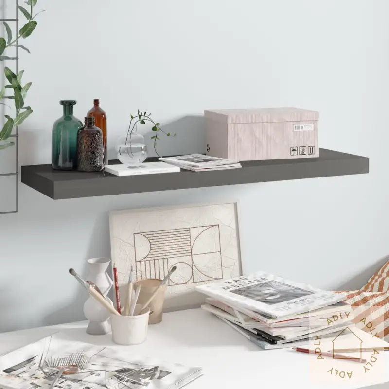 Hyllen er produsert i høykvalitets bikake MDF og har en solid metallramme, noe som gir både god stabilitet og lang holdbarhet. Dette gir en robust overflate som kan holde opptil 10 kg, så du kan trygt stille ut møbler til hjemmet eller diverse favoritting. Med sitt minimalistiske design i høyglans grå passer hyllen sømløst inn med de fleste møbler og dekorasjoner, og gjør selv en naken vegg til et stilig interiørelement. Enkelt, flott og funksjonelt – denne vegghyllen gir deg mange praktiske muligheter, samtidig som den løfter helhetsinntrykket av hjemmet ditt.