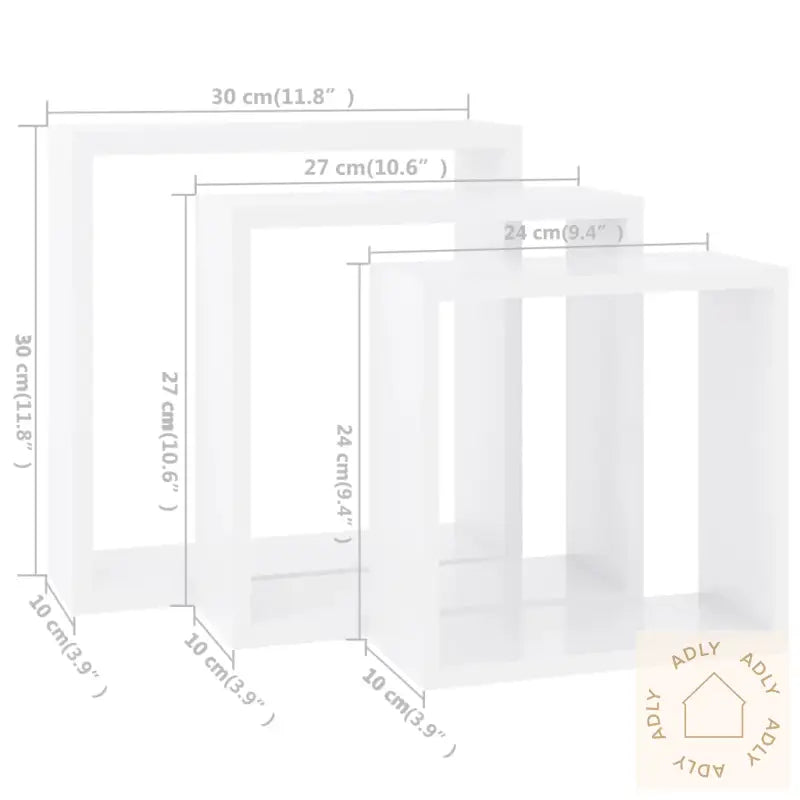 Farge: hvitMateriale: MDFMål stor kubeformet hylle: 30 x 10 x 30 cm (B x D x H)Mål middels kubeformet hylle: 27 x 10 x 27 cm (B x D x H)Mål liten kubeformet hylle: 24 x 10 x 24 cm (B x D x H)Maksimal lastekapasitet (hver): 5 kgUsynlig monteringssystemMontering kreves: jaLeveransen inneholder:3 x hyller