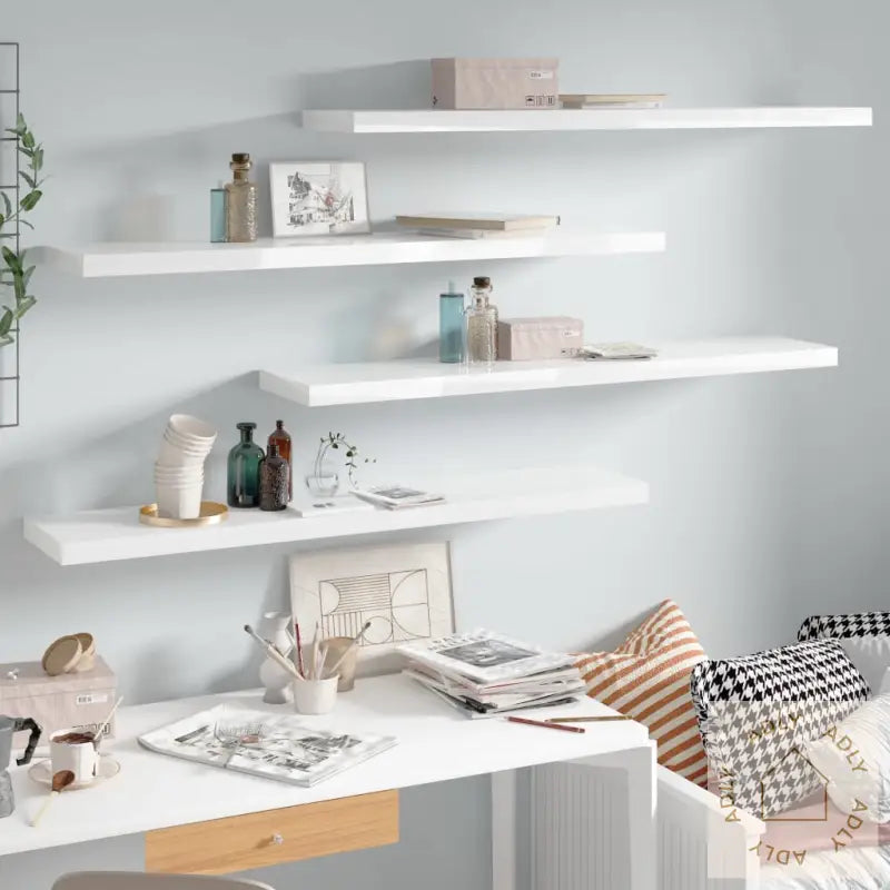Farge: høyglans hvitMaterialer: bikake MDF, metallMål: 120 x 23,5 x 3,8 cm (L x B x H)Maksimal lastekapasitet (hver): 10 kgUsynlig monteringssystemMontering kreves: jaLeveransen inneholder:4 x vegghyller