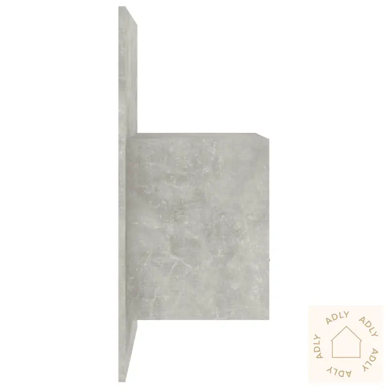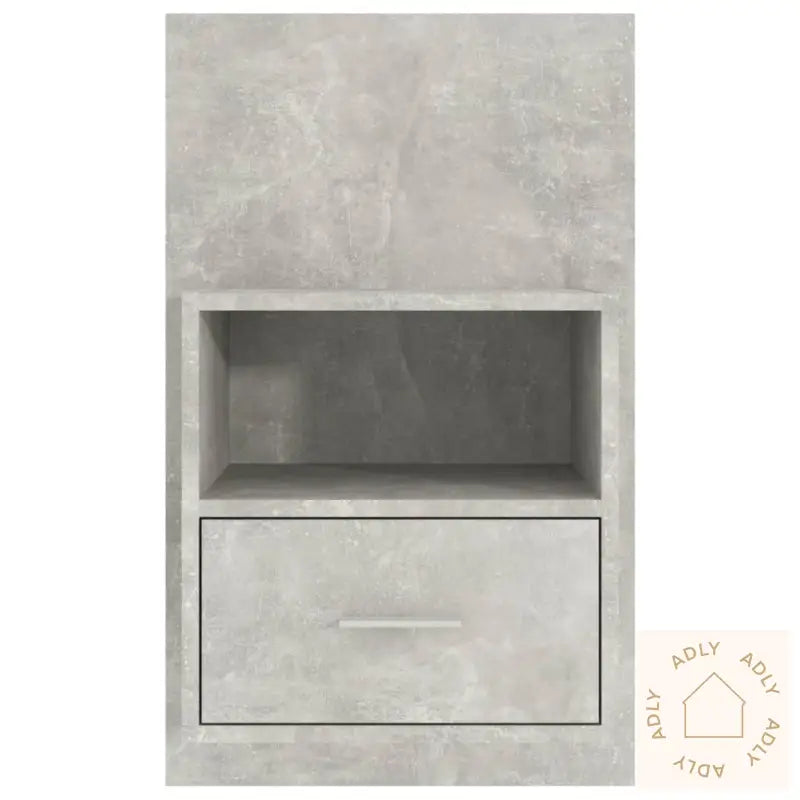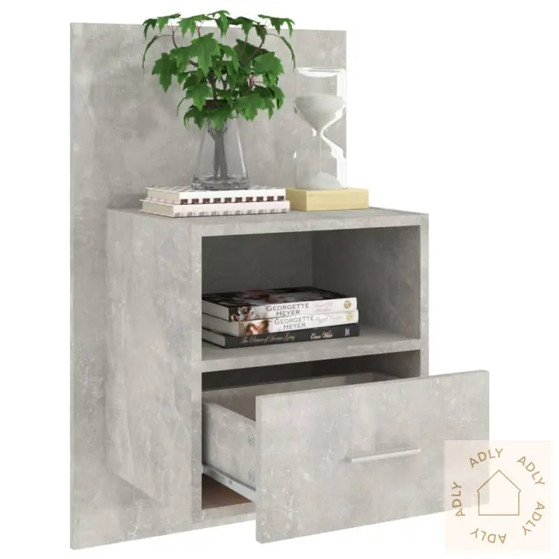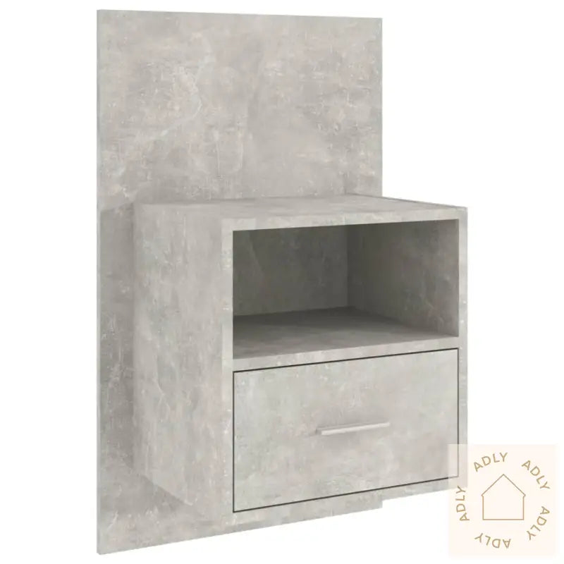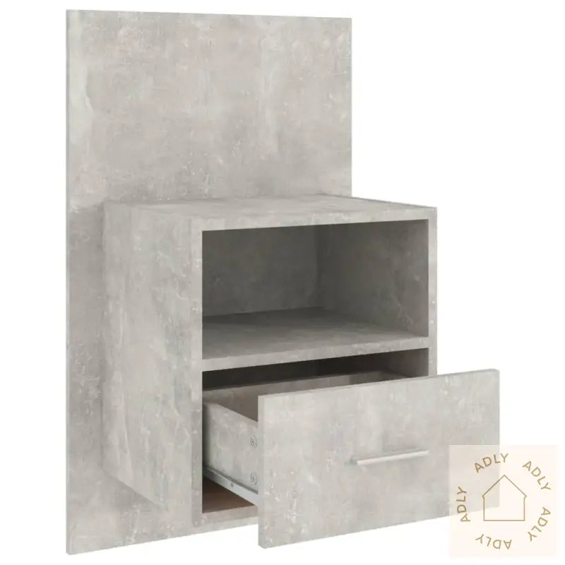 Skrue(r) og plugg(er) for montering i veggen er ikke inkludert. Velg riktig skrue(r) og plugg(er) tilpasset din veggtype. Ved usikkerhet bør du søke profesjonell hjelp. Les nøye gjennom monteringsinstruksjonene før du starter.Farge: betonggråMateriale: konstruert treSamlet mål: 48,5 x 32,5 x 80 cm (B x D x H)Mål (kun nattbord): 38 x 31 x 39,5 cm (B x D x H)Montering kreves: ja