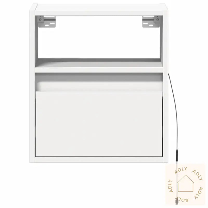 Stabilt og slitesterkt materiale: Nattbordet er laget av konstruert tre, som gir en jevn overflate og en robust konstruksjon. Dette materialet er kjent for å være motstandsdyktig mot fukt, vridning og sprekker, og er derfor et sikkert valg både for deg som ønsker gode og holdbare møbler til hjemmet.RGB LED-lys for personlig stemning: Skap akkurat den atmosfæren du vil ha på soverommet med LED-lys som enkelt kan justeres. Velg mellom ulike farger, moduser og lysstyrke for å tilpasse belysningen etter humør og behov – perfekt for å gjøre kvelden ekstra avslappende.Smart oppbevaringsplass: Med én skuff og ett åpent rom får du plass til alt fra bøker og blader til fjernkontroller og mobilladere, slik at småting alltid er lett tilgjengelig og organisert. Ideelt for å holde soverommet ryddig og oversiktlig.Plassbesparende og effektivt: Takket være det veggmonterte designet får du frigjort gulvplass, samtidig som du trygt og enkelt kan lage en praktisk oppbevaringsløsning hvor enn du trenger den. Perfekt for mindre rom eller steder der smarte løsninger teller.Godt å vite: