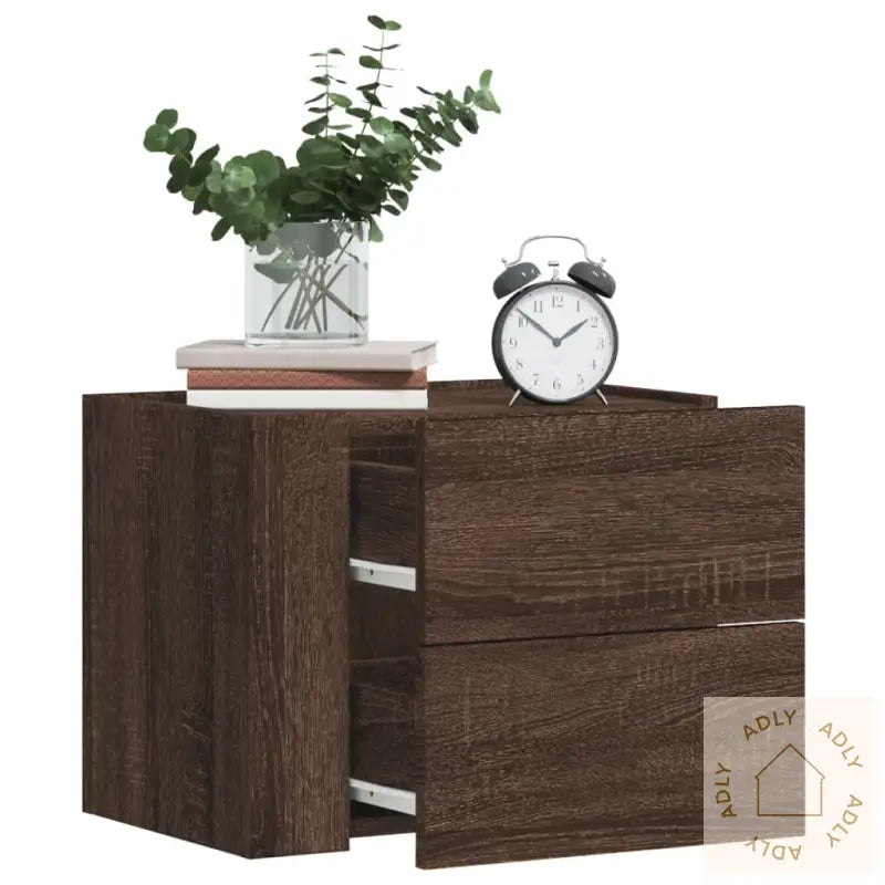 Skruer og plugger for veggmontering følger ikke med. Velg skruer og plugger som er tilpasset akkurat dine vegger, og spør gjerne en fagperson om du er usikker. Husk å følge monteringsanvisningen nøye for best resultat.Farge: brun eik – en klassisk og varm finish som matcher de fleste interiørstiler og som kombinert med f.eks. andre hagemøbler gir et helhetlig uttrykk i hjemmet.Materiale: konstruert treMål: 45 x 30 x 35 cm (L x B x H)Maksimal lastekapasitet (totalt): 50 kgMaksimal lastekapasitet (skuff): 5 kgMaksimal lastekapasitet (øverste lag): 30 kgMontering kreves: jaLeveransen inkluderer:2 x veggmonterte nattbord