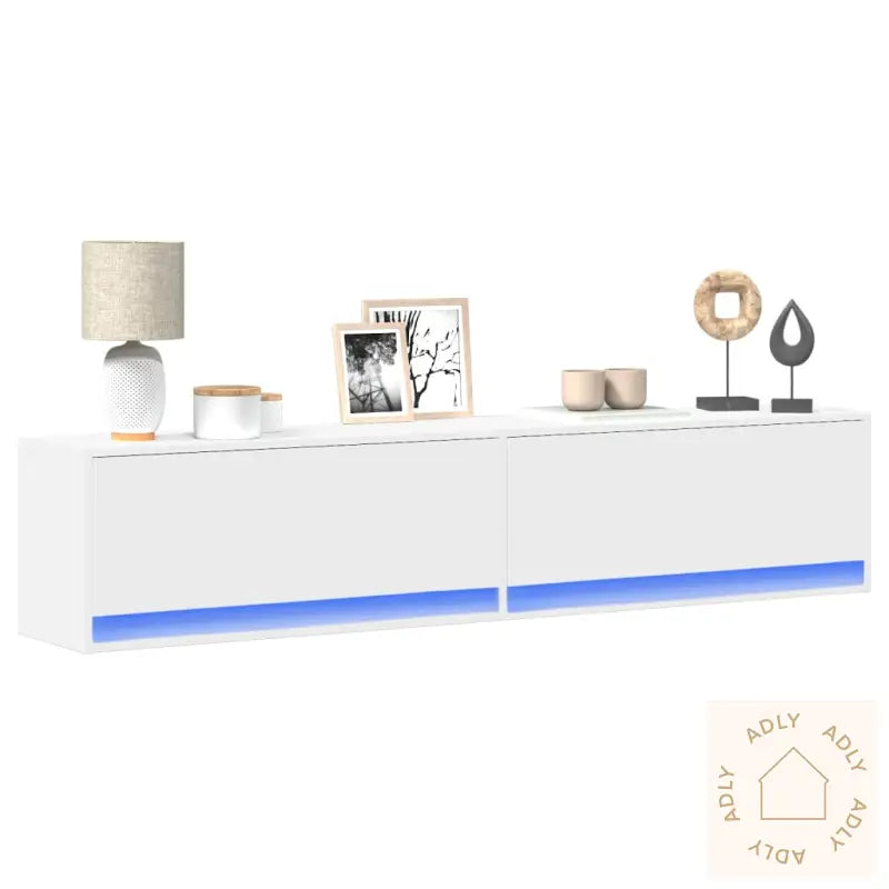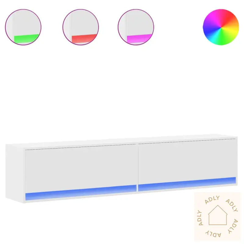 Stabilt og slitesterkt materiale: Benken er laget av konstruert tre – et robust og motstandsdyktig materiale som sikrer lang levetid. Overflaten er jevn og enkel å rengjøre, i tillegg til at den tåler fukt og holder seg pen over tid. Dette gjør TV-benken til et pålitelig møbelvalg for hjemmet ditt.RGB LED-lys for stemning og stil: Skapet er utstyrt med dekorative LED-lys som kan stilles inn etter humøret ditt. Velg blant ulike farger, effekter og lysstyrker for å skape en hyggelig og tilpasset atmosfære i stuen – perfekt for filmkvelder eller hverdagsbruk.Rikelig med oppbevaring: Du får god plass til oppbevaring av magasiner, bøker, dvd’er og annet tilbehør, slik at alt holder seg organisert. Med smarte rom og skuffer holder du stueområdet både ryddig og stilig.Plassbesparende veggmontert design: TV-benken monteres enkelt direkte på veggen. Det betyr maksimering av gulvplassen, noe som gir rommet et moderne og luftig preg. Perfekt for deg som ønsker funksjonelle og stilige møbler til hjemmet.Godt å vite: