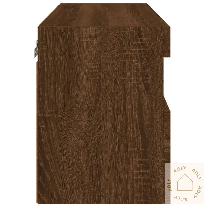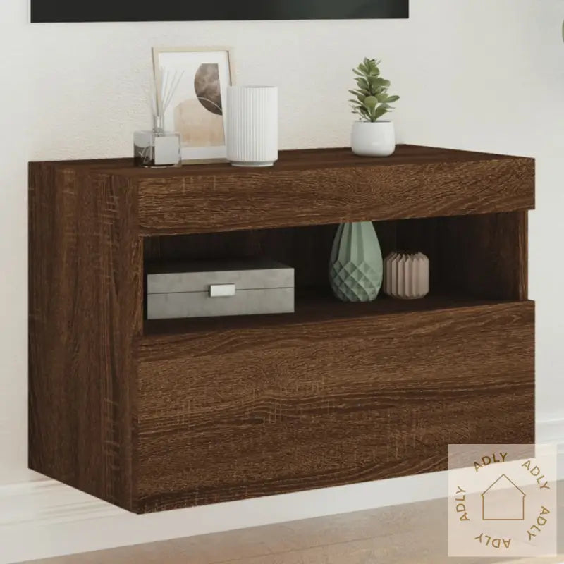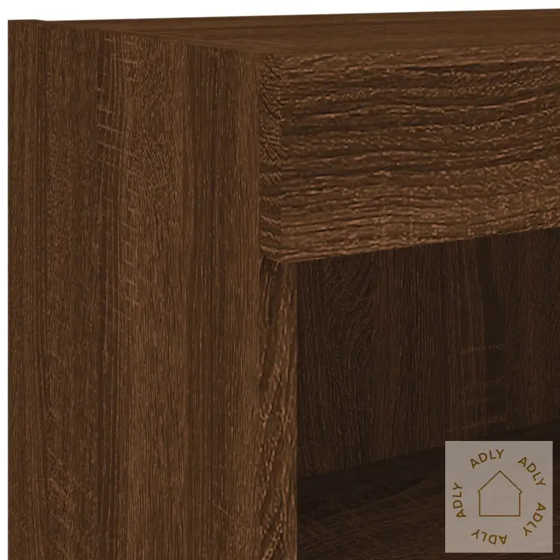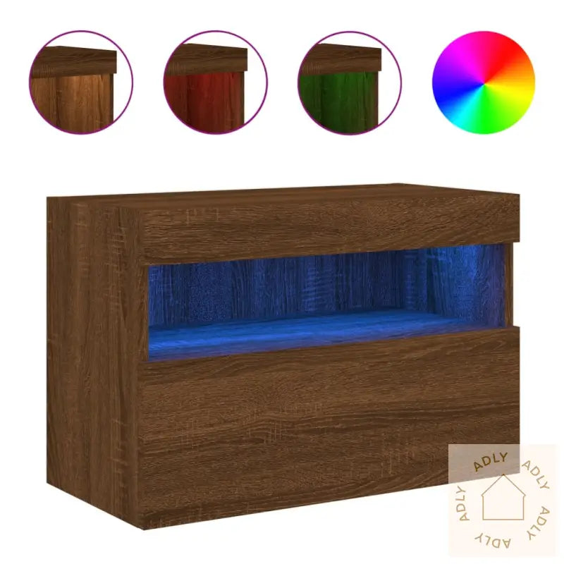 Slitesterkt materiale: Benken er laget av konstruert tre i brun eik, et solid og holdbart materiale med en jevn overflate. Dette gir benken både styrke og stabilitet, samt en robust motstand mot fuktighet. Med sin finish i brun eik passer den perfekt sammen med både moderne og klassiske interiørstiler.RGB LED-lys: Skapet har integrerte RGB LED-lys, som gir deg mulighet til å endre stemingen i rommet raskt og enkelt. Velg blant flere farger eller legg til dynamiske lysmoduser for å matche humøret ditt eller anledningen. LED-lysene gjør at skapet får et trendy preg og blir et synlig blikkfang blant møblene dine.Rikelig med lagringsplass: Du får god plass til å oppbevare småting, alt fra bøker til DVD-er og magasiner. Hyllene holder tingene dine oversiktlig organisert, samtidig som alt er enkelt å nå når du trenger det. Perfekt for deg som ønsker et ryddig og innbydende hjem.Allsidig: Tv-benken er flerbruksmøbel – bruk den som vegghengt nattbord eller kombiner flere skap for å lage en helhetlig vegg med ekstra oppbevaring. Dette gjør den ideell både på soverom, stue og kontor, og den kan lett matches med ulike typer hagemøbler eller andre møbler til hjemmet.Veggmontert design: Det plassbesparende veggfestet løfter møbelet fra gulvet og gjør det enkelt å holde området rundt rent. Løsningen frigjør gulvplass, noe som også gir bedre romfølelse.Godt å vite: