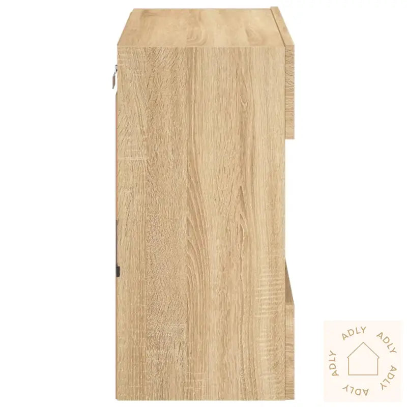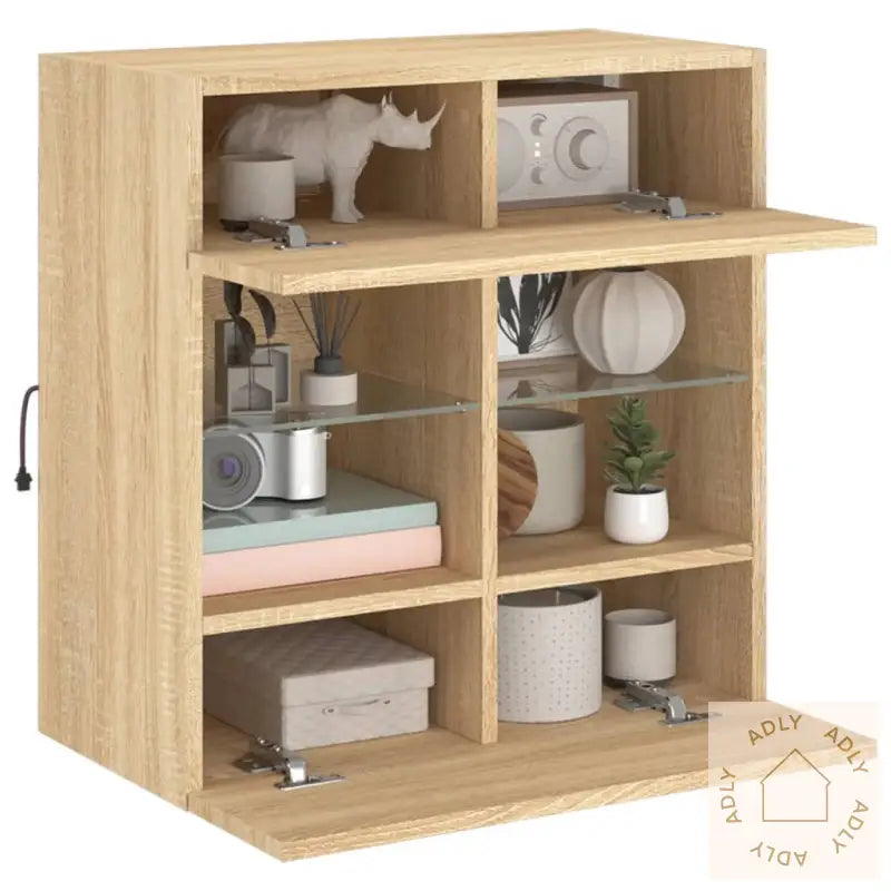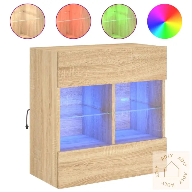 Slitesterkt materiale: TV-benken er laget av konstruert tre, som gir en elegant og glatt overflate. Materialet har utmerket kvalitet med styrke, stabilitet og en god motstand mot fuktighet, noe som gjør møbelet holdbart og enkelt å rengjøre.RGB LED-lys: Med innebygd rgb led-lys får du ikke bare et møbel som lyser opp stuen, men også muligheten til å velge mellom flere farger og effekter. Du kan enkelt endre stemning etter behov – enten du ønsker en rolig kveld eller livlig underholdning. Disse LED-lysene fremhever den trendy stilen og gir rommet et ekstra løft.Rikelig med lagringsplass: Skapet har to stilrene glasshyller samt fire rom bak dører hvor du kan oppbevare småting som bøker, DVD-er og magasiner pent organisert. Alt blir lett tilgjengelig, og du slipper rot i nærheten av TV-en.Allsidig: Dette veggskapet kan brukes både som TV-benk og vegghengt nattbord, noe som gjør det ideelt for ulike rom og behov. Dersom du ønsker å sette sammen flere skap, kan du skape en imponerende veggløsning tilpasset din stil. Passer fint både alene eller sammen med andre sonoma eik-møbler.Veggmontert design: Ved å montere benken på veggen sparer du gulvplass og gir rommet et mer åpent og luftig preg. Den veggmonterte løsningen gjør renhold enklere og gir deg et stilrent uttrykk.Godt å vite: