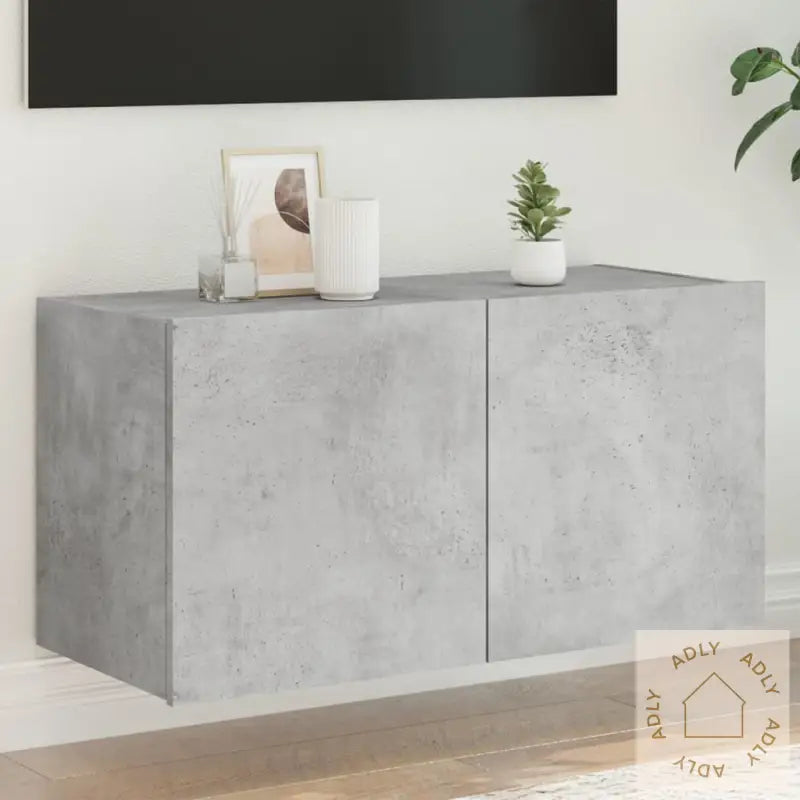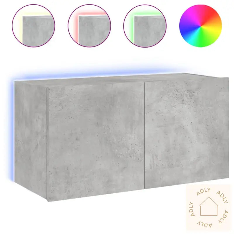 Skruer og plugger til veggmontering følger ikke med. Velg alltid festemateriale som passer for akkurat din veggtype, og spør gjerne en fagperson hvis du er usikker. Husk å lese og følge monteringsanvisningen nøye for trygg montering.TV-benken leveres med USB-kontakt for RGB led-lys, og krever en sertifisert 5V USB-strømkilde (ikke inkludert).Farge: betonggrå – en moderne fargetone som passer til de fleste interiørerMateriale: konstruert tre, kjent for slitestyrke og enkel vedlikeholdMål: 80 x 35 x 41 cm (B x D x H)Mål pr. rom: 38 x 35 x 37 cm (B x D x H)Montering kreves: ja