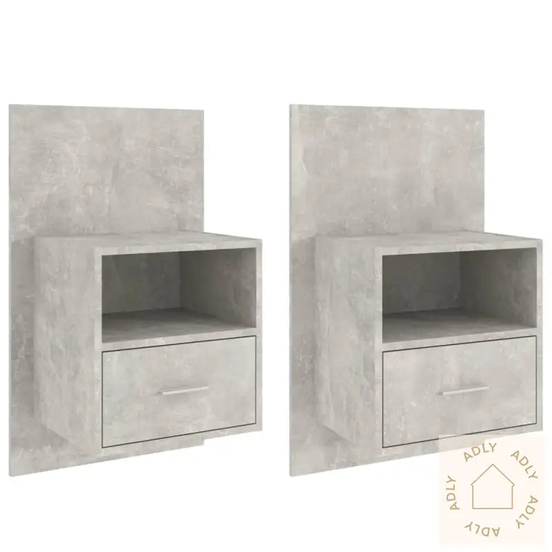 Skrue(r) og plugg(er) for montering i veggen følger ikke med. Bruk alltid riktige festemidler tilpasset dine vegger, og rådfør deg med fagperson hvis du er usikker. Følg instruksjonene nøye for sikker og korrekt montering.Farge: betonggråMateriale: konstruert treSamlet mål: 48,5 x 32,5 x 80 cm (B x D x H)Mål (kun nattbord): 38 x 31 x 39,5 cm (B x D x H)Montering kreves: jaLeveransen inneholder:2 x vegghengte nattbordVelg disse nattbordene for å få mest mulig ut av plassen hjemme – ideelt enten du innreder soverommet, gjesterommet eller kanskje ønsker praktisk lagringsplass i et multifunksjonelt rom. Kombiner gjerne med andre møbler fra vårt utvalg for en stilfull og funksjonell helhet. Veggmonterte nattbord er et populært valg når du vil oppgradere hjemmet ditt med moderne, smart design.