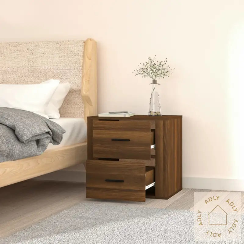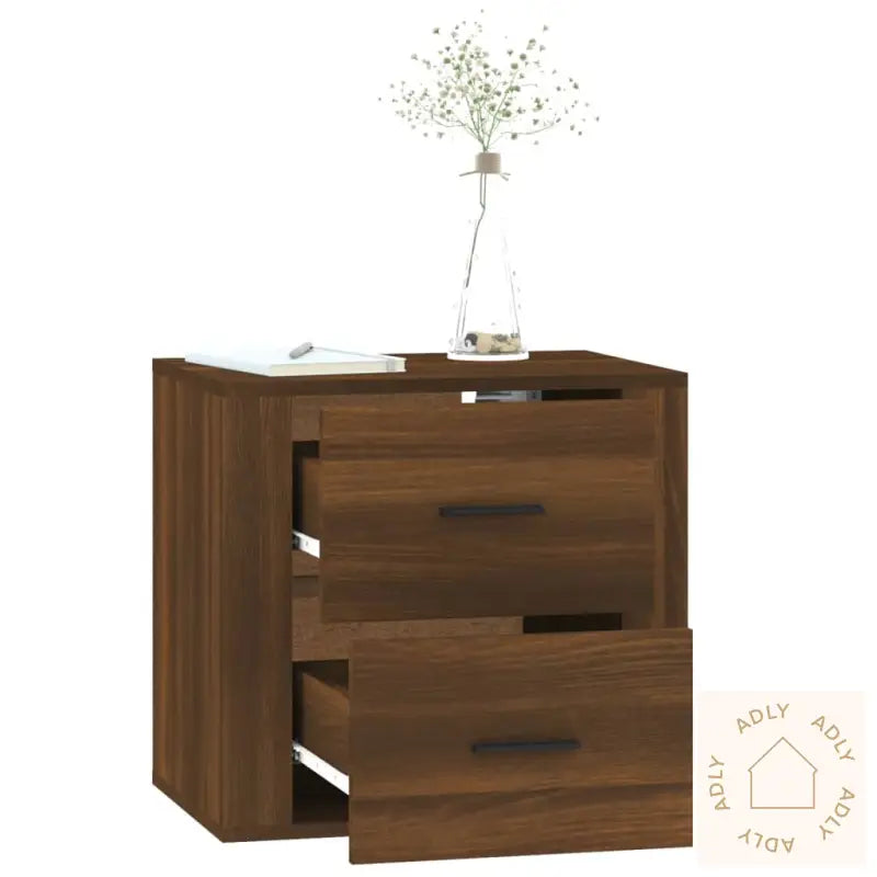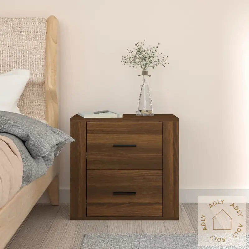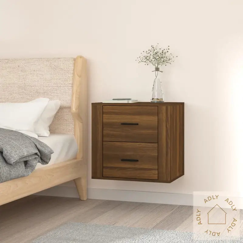 Lag i solid, konstruert tre: Materialet gir nattbordet både stabilitet og lang holdbarhet, samtidig som den glatte overflaten gjør det enkelt å holde rent. Treet er også motstandsdyktig mot fuktighet, noe som beskytter nattbordet over tid.Smart oppbevaring: Med dette veggmonterte nattbordet får du masse lagringsplass med enkel tilgang til bøker, magasiner, fjernkontroller eller andre små nødvendigheter. Det hjelper deg å holde orden og gir et ryddig soverom uten rot.Plassbesparende design: Siden nattbordet henger på veggen, frigjør du gulvplass – perfekt for mindre rom eller hvis du bare ønsker en mer minimalistisk stil. Det gir rommet et moderne uttrykk og gjør rengjøring enklere.Stødig bordplate: Den solide overflaten er ideell til å plassere en bordlampe, vekkerklokke eller favorittboken din. Overflaten tåler daglig bruk og gir trygg støtte til tingene du trenger ved sengen.Nattbordet har en lekker finish i brun eik, noe som gir en varm og naturinspirert følelse på soverommet. Dette er et perfekt valg enten du skal fornye soverommet eller leter etter stilige og funksjonelle veggmonterte nattbordet til moderne hjem.