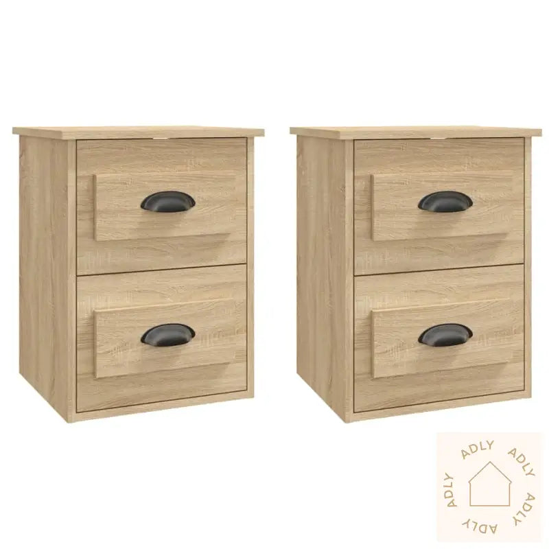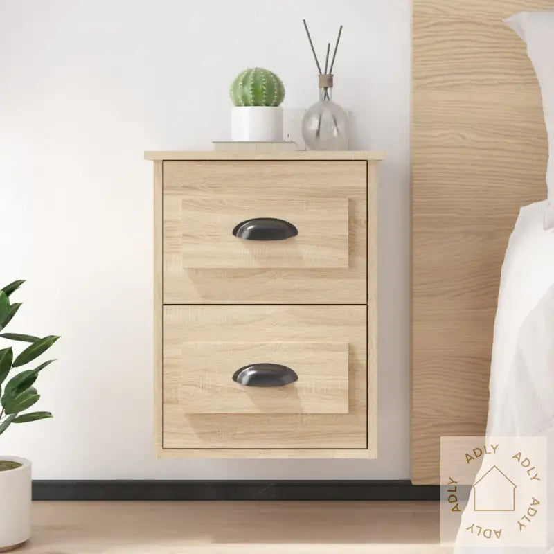 Slitesterkt materiale: Det konstruerte treverket sørger for at veggmonterte nattbordet holder seg pent over tid. Overflaten er glatt, og materialet er kjent for sin styrke, stabilitet og motstand mot fukt – ideelt for daglig bruk.Rikelig lagringsplass: Med to dype skuffer får du god plass til å organisere bøker, ladere eller småpersonlige eiendeler. Alt du trenger før leggetid er lett tilgjengelig.Veggmontert design: Siden nattbordet monteres rett på veggen, sparer du verdifull gulvplass og får et ryddigere soverom. Det gjør også rengjøringen lettere, og gir et luftig uttrykk til rommet.Stabil og solid bordplate: Toppen av nattbordet i sonoma eik er ideell for å vise frem dekor, fotorammer eller små potteplanter. Plassen kan også brukes til nødvendig tilbehør ved sengen, som vekkerklokke eller leselampe.Godt å vite: