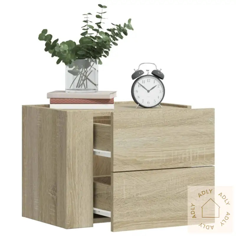 Skruer og plugger til montasje på veggen følger ikke med. Det anbefales å bruke festemidler som passer til nettopp dine vegger. Er du usikker, kan det være lurt å spørre en fagperson. Husk å lese og følge instruksjonene nøye for sikker montering.Farge: sonoma eik for et moderne og varmt uttrykkMateriale: konstruert tre som gir både estetikk og holdbarhetMål: 45 x 30 x 35 cm (L x B x H) – en kompakt og praktisk størrelseMaksimal lastekapasitet (totalt): 50 kg, slik at du kan utnytte plassen optimaltMaksimal lastekapasitet (skuff): 5 kg for oppbevaring av mindre eiendelerMaksimal lastekapasitet (øverste lag): 30 kg for dekor eller lamperEnkel montering – instruksjoner følger medEnten du ser etter et nytt veggmontert nattbordet med sonoma eik-finish til soverommet eller ønsker en smart oppbevaringsløsning i stuen, gir dette møbelet deg både allsidighet, moderne design og praktisk lagring. Tilfør hjemmet ditt det lille ekstra!