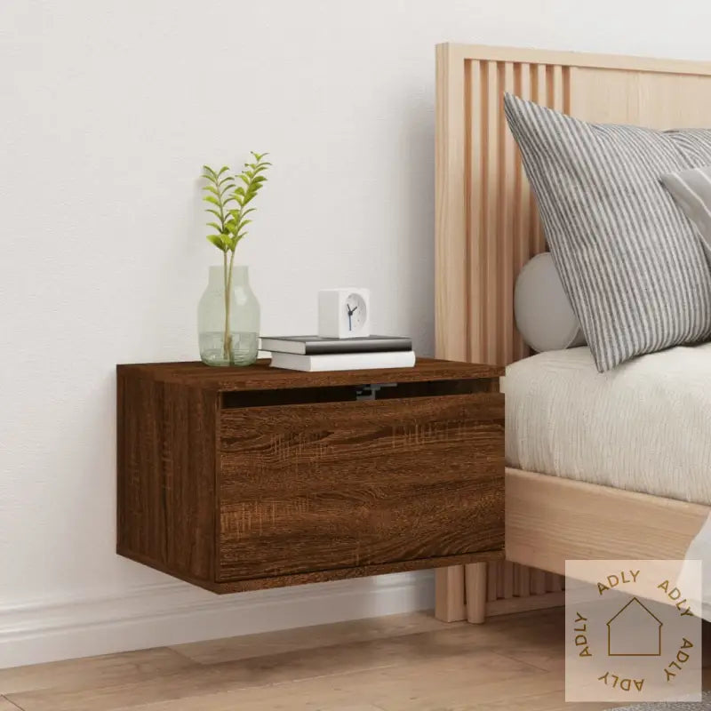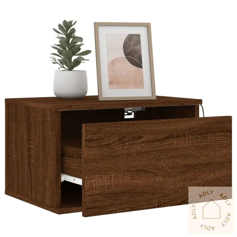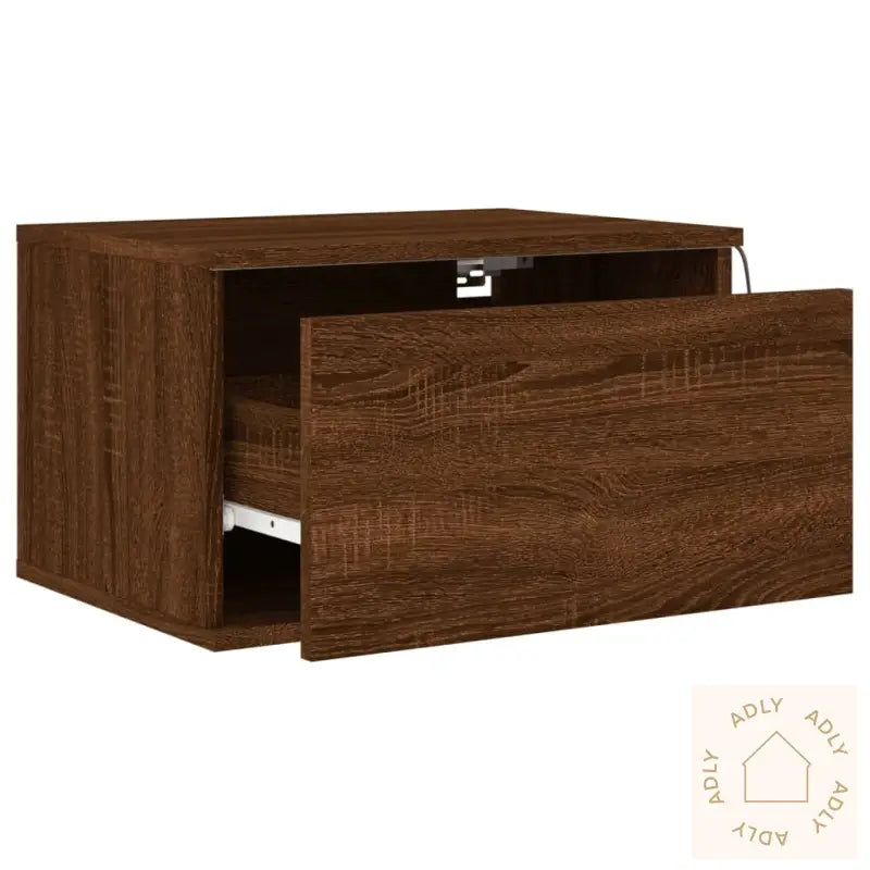 Skruer og plugger for montering på veggen følger ikke med. Sørg for å velge festemidler som passer godt til akkurat din veggtype, og kontakt gjerne en fagperson om du er usikker. Følg alltid monteringsanvisningen nøye for et trygt og stabilt resultat.Nattbordet kommer med en USB-kontakt for LED-lysene, og trenger derfor en ekstern 5V USB-strømkilde (denne er ikke inkludert).Fargen brun eik gir nattbordet et tidløst og naturlig uttrykk, som passer inn i de fleste interiørstiler, både klassiske og moderne.Produsert i slitesterkt konstruert tre for ekstra holdbarhet.Mål: 50 x 36 x 30 cm (bredde x dybde x høyde).Noe montering kreves.