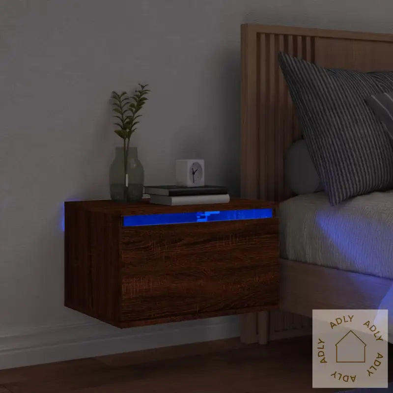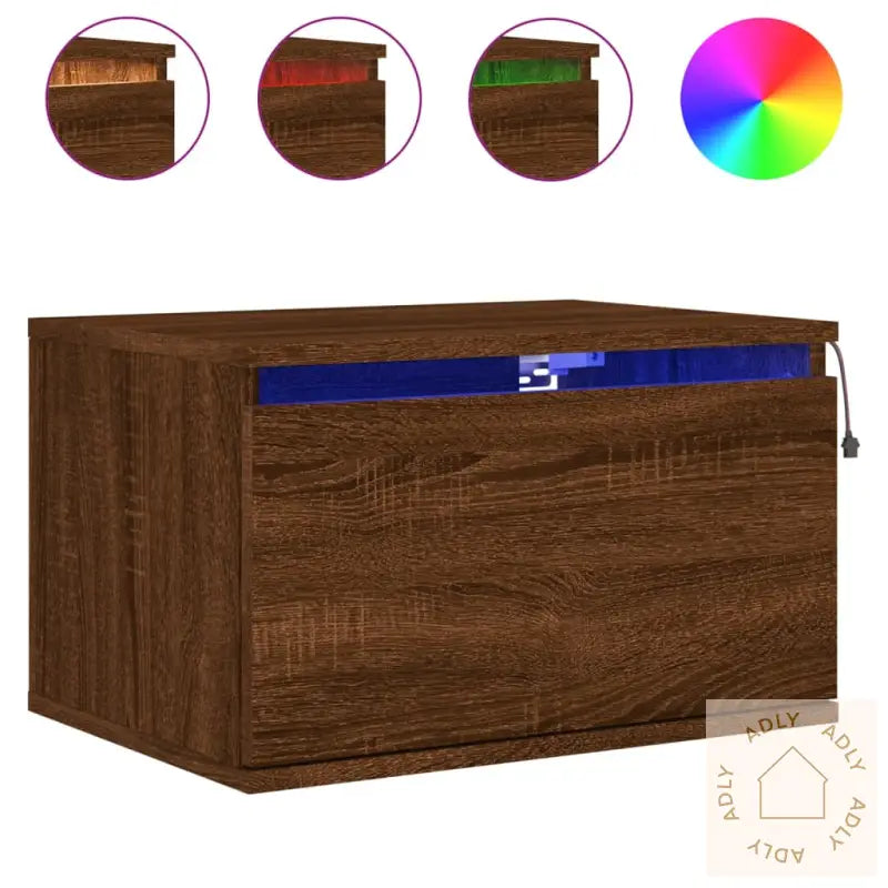 Materialet er laget av konstruert tre, kjent for både sin styrke og evne til å tåle daglig bruk. Overflaten er glatt, enkel å vaske av, og tåler fukt bedre enn mange andre materialer. Dette gir deg et nattbord som varer, samtidig som det krever lite vedlikehold.RGB LED-lysene tar innredningen til et nytt nivå! Med disse levende lysene kan du velge mellom mange farger og lysmoduser, eller la nattbordet skifte farger automatisk alt etter stemning eller behov. LED-lysene gjør ikke bare nattbordet mer moderne, men gir også et trendy blikkfang til soverommet ditt.Siden dette er et veggmontert nattbord, slipper du at det opptar plass på gulvet. Dermed kan du utnytte rommet optimalt, samtidig som rengjøring blir enklere. Det gir også en luftig og minimalistisk følelse til rommet.Det flytende nattbordet er ikke bare en praktisk oppbevaringsplass, men også et dekorativt element som gir et eksklusivt preg på veggen. Her kan du sette frem bøker, pyntegjenstander, små planter eller ting du vil ha lett tilgjengelig ved sengen.Godt å vite: