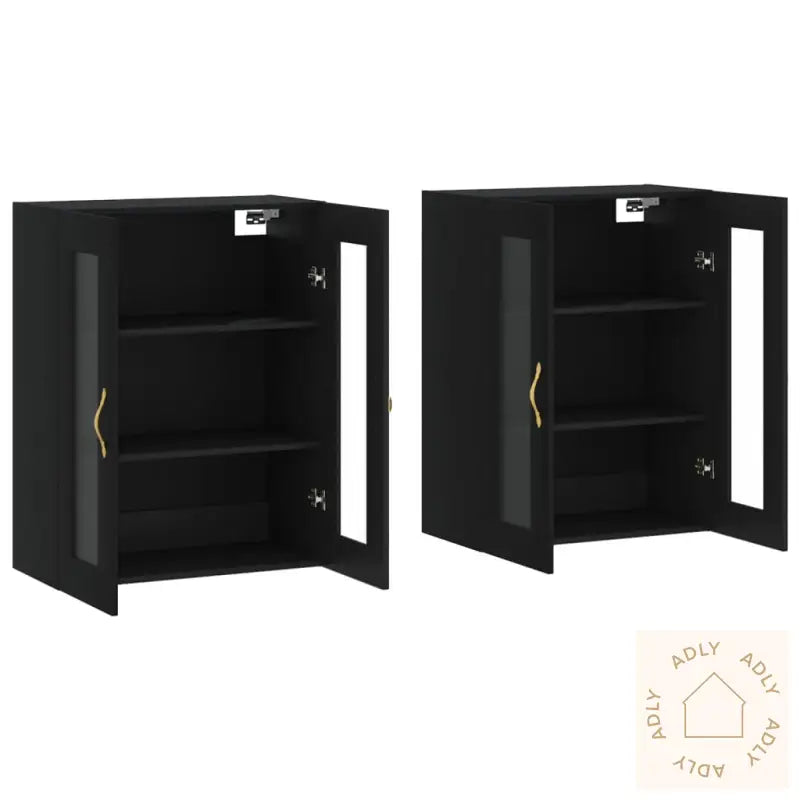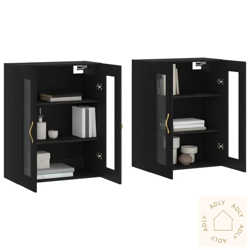 Skruer og plugger for veggmontering følger ikke med. Sørg for å bruke festemidler som passer til dine vegger. Spør en fagperson hvis du er usikker, og følg instruksjonene nøye for enkel og trygg montering.Farge: SvartMateriale: Konstruert tre, glassMål (hver): 69,5 x 34 x 90 cm (B x D x H)Montering kreves: JaLeveringen inneholder:2 x vegghengte skap